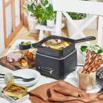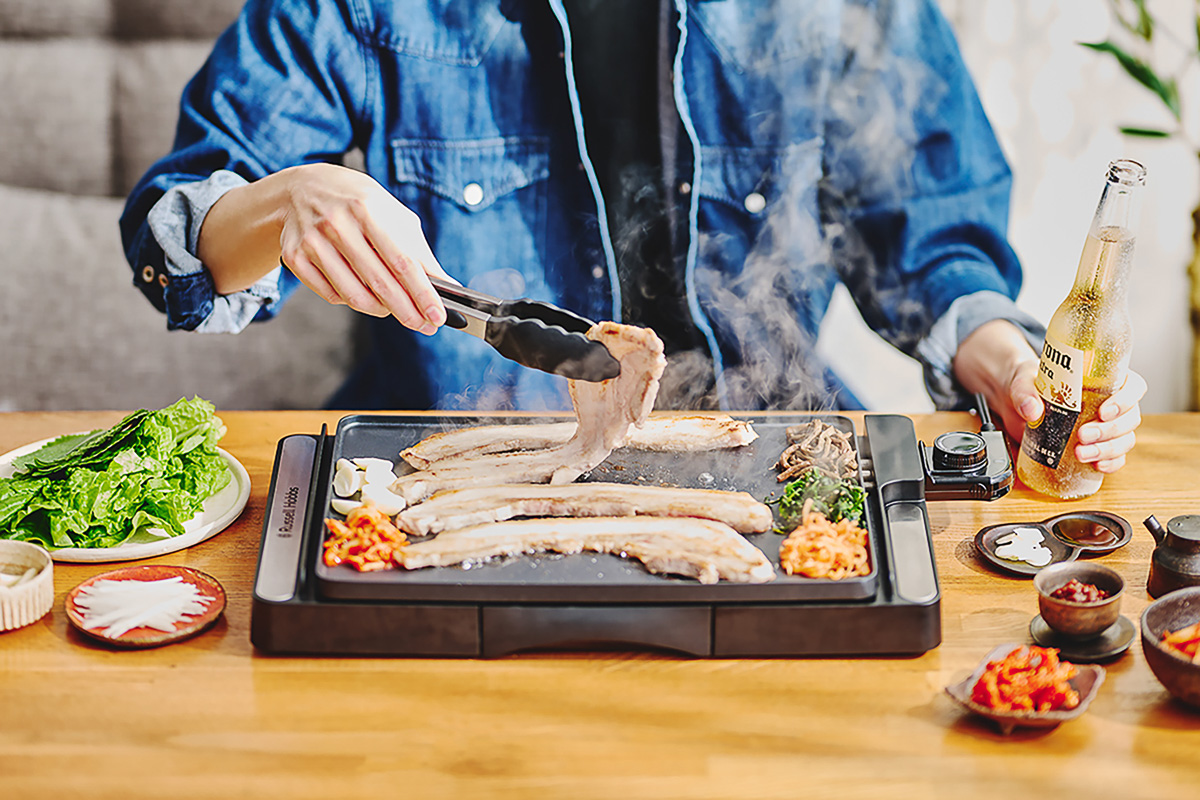 鋳鉄製スキレットと減煙プレートが付属した新感覚の調理家電。減煙プレート使用時は、水分や油は水受け皿に落ちるため煙が発生しにくく、室内でも手軽に焼肉を楽しめる。幅約18cm。