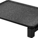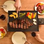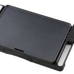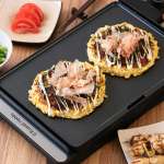 薄型&一体型構造で立てて収納できる点が特徴。4段階温度調節や保温機能を備え、鉄板焼き気分を演出する石目風プレートはフッ素コーティングで手入れも簡単。幅約 40cm。