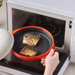 特許取得の特殊構造によりマイクロ波に反応してプレートが300度以上に発熱。電子レンジでもフライパンのような調理が可能だ。焼きサバなら約4分で香ばしい焼き目が付く。