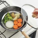 セットするだけでいつものフライパンが蒸し器に。少量の水であっという間に蒸しあがるので栄養価を損なわず肉は余分な脂が切れてヘルシーに仕上がる。食材の下ごしらえにもおすすめ。