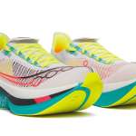 大きく反り上がった前足部のロッカー構造、反発性の高い2層構造ミッドソールなど走りのペースを押し上げるディテールが多数。アッパーは軽量性に優れ、通気性も優秀。