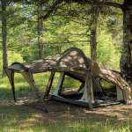 ソロ用ながら有効面積の広い2ルーム構造。オーバーハング設計で快適空間を確保し、アーチフレームで風に強い。前後左右を大きく開放でき、広いメッシュで通気と眺望も良好。インナーを外せばシェルターとしても活躍。