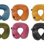 本体の丸いポンプを押すことで、最速30秒で膨らませることが可能なネックピロー。空気穴のボタンを押すと空気が抜け、自分好みの固さに調整できる。コンパクトに持ち運べる収納ポーチ付き。