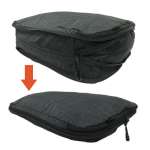 周囲のファスナーを閉めると、高さを10cmから3cmに圧縮できる収納袋。ファスナーは引きやすく、生地を挟み込まないように設計。フタ部分にポケットも備える。W34×D27cm