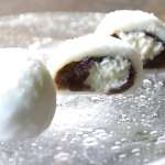 じっくり炊き上げた有機栽培のえりも小豆の粒あんと、北海道の草原から届いたグラスフェッドミルクのクリームを使用。それを北海道の粉雪のようなふわふわのお餅で包み込んだ。