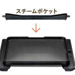 ▲さまざまな加熱調理ができる角皿が付属。奥にスチームポケットを取り付ければ蒸し料理にも対応できる