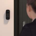 玄関のサムターンにあわせて設置するだけで鍵をスマホから開けられるようになるスマートロック。さらに数字キーや指紋認証に加えて顔認証での解錠も可能となる。