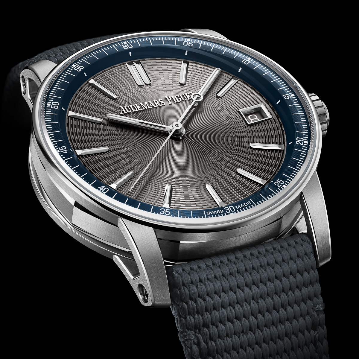 ポリッシュとサテンを繊細に切り替えた仕上げが、ステンレスに柔らかな陰影を宿し、光の角度ごとに異なる表情を描き出している。その奥行きこそが、オーデマ ピゲらしい建築的造形美をより際立たせているのだ。また、グレーとブルーを重ねた控えめな配色も深みがあり、長く愛される“一生モノ”としての風格を感じさせる。