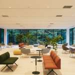 ▲周囲を緑に囲まれた立地を最大限に生かしたフリースペースは、業務合間のひと休憩などで誰でも利用可能。インテリアがあえてバラバラなのも息苦しさを感じさせず居心地が良い