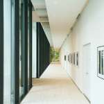 ▲真っ直ぐ伸びる廊下は天井が通常よりも高く設計されており、開放感のある空間作りが行われている。壁には同社製品を使い撮影された写真作品が整然と並び、来訪者を出迎える
