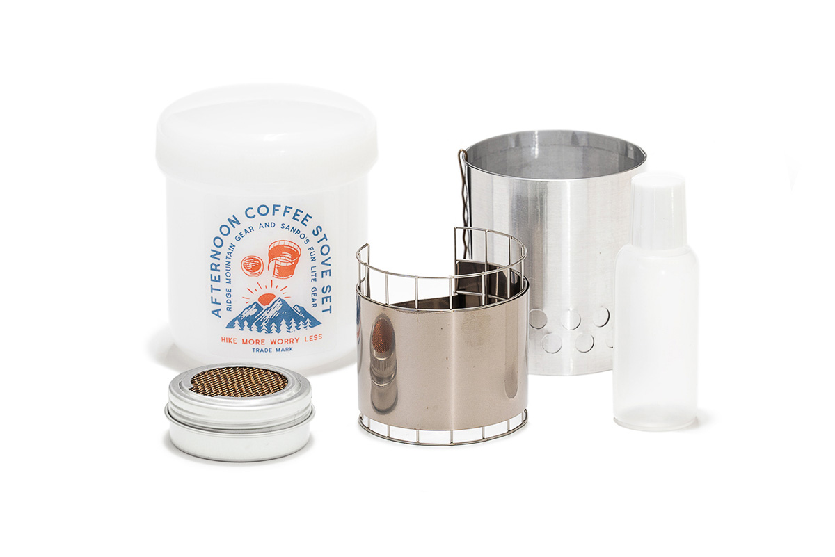 ストーブ、風防、ゴトク、燃料ボトルがセットに。どこでもコーヒーが楽しめる。