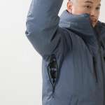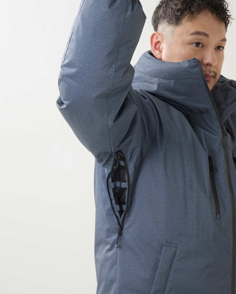 脇下に備えたベンチレーションが、このダウンの使い勝手を大きく底上げ。メッシュ構造の開口部から熱と湿気を逃がせるため、歩行や自転車移動などで体温が上がっても快適性をキープ。