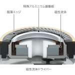 ▲従来は大型スピーカー等の放熱を目的に使われていた「磁性流体」をドライバーに活用した。振動板の動きを安定させることで、歪みを抑え、空間再現性もアップ