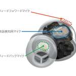 ▲フィードフォワードマイク、発話検知用マイク、フィードバックマイクの3つ、左右合計で6つのマイクを搭載。AIプロセッサーの処理により、風切音や、通話時のノイズもしっかり低減する