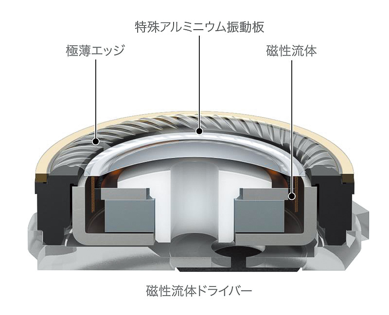 ▲従来は大型スピーカー等の放熱を目的に使われていた「磁性流体」をドライバーに活用した。振動板の動きを安定させることで、歪みを抑え、空間再現性もアップ
