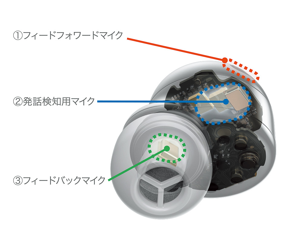 ▲フィードフォワードマイク、発話検知用マイク、フィードバックマイクの3つ、左右合計で6つのマイクを搭載。AIプロセッサーの処理により、風切音や、通話時のノイズもしっかり低減する
