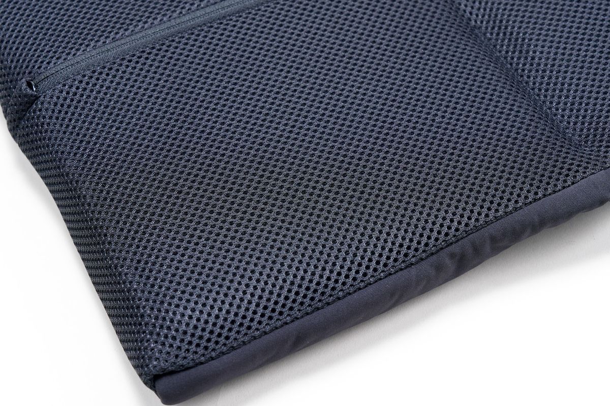 通気性もよく、ムレにくい構造のため湿気がこもらず、ダニやカビ対策にもぴったり。もちろん中材は取り出して水洗いも可能で、いつでも清潔を保てます。二つ折りにするとA4サイズほどにコンパクトにまとまります。専用バッグ付き。サイズ:約40×30×4cm、重量:0.3kg