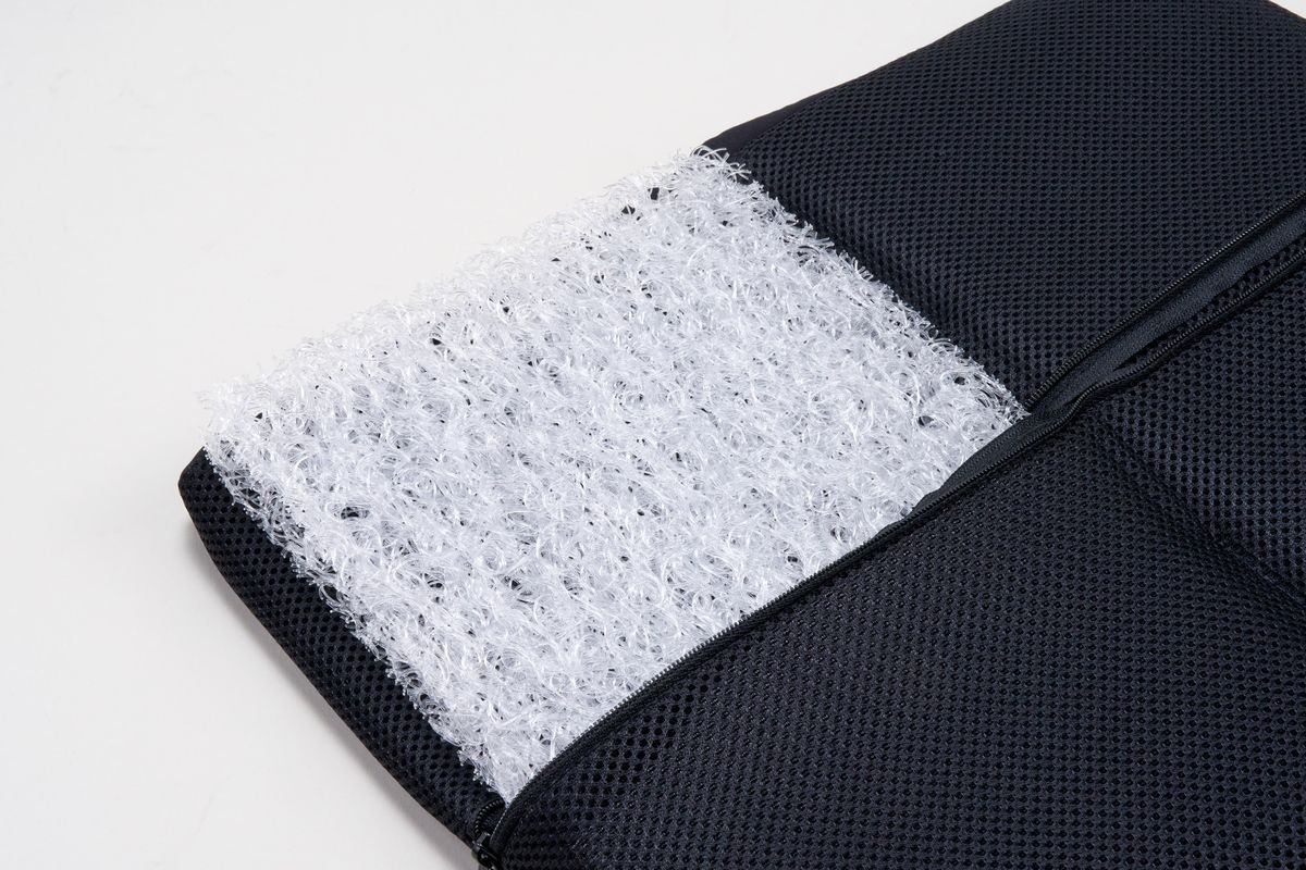 マットレスなど寝具を取り扱うエアウィーヴのポータブルクッション。中材には体積の90%以上が空気の“エアファイバー”を採用。肌あたりがやさしく改良されており、カバーの質感が向上。優れた復元性を持ち、三次元状に絡み合ったファイバーが、あらゆる方向からお尻を支えてくれます。