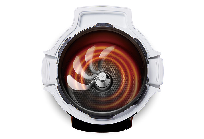 独自の「かきまぜパドル」が自動で鍋底から食材をかえしながら混ぜてくれるので、まとめて食材を入れてボタンを押すだけ。炒飯や焼きそばもボタンひとつで調理が可能。