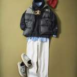 最早定番となったストリートMIX。アクティブさが漂う着こなしですが、大人っぽさを保ちつつ楽しむにはどうすれば良いか? 答えは簡単で、ダウンベストはインナー使いとは反対にブラックなどの暗色がおすすめ。もとより軽快なイメージの着こなしなので、落ち着いた色味のモノを選ぶことでバランスを調整すると良いでしょう。アクティブな着こなしなら落ち着いた色味、暗めの着こなしならその逆を、というのがダウンベストの着こなしの言わば方程式です。