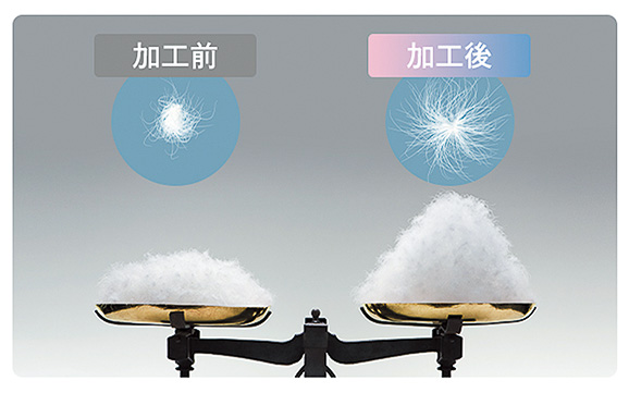 ▲独自の「フレッシュアップ加工」によりダウンに空気を含み、柔らかくふっくらとして暖かさが増す