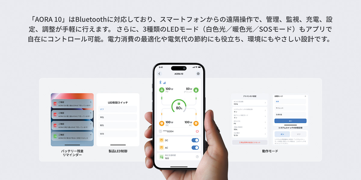 ▲白色光に暖色光、SOSモードの3種類のLEDモードを搭載しているので、非常灯用にも便利。スマホアプリでコントロールもできる