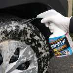 専用のクリーナーを使用するとスプレーした瞬間から汚れが流れ出す。このときトレッド部分には液剤ができるだけかからないよう注意しよう。(写真はリンレイの「ウルトラハードクリーナー ホイール&タイヤ用」)