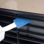 鏡とユニットの隙間には砂や土ぼこりが詰まっていることが多い。写真のようにスクレーパーと薄手のウエスを併用して掃除するといい。