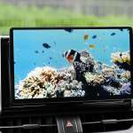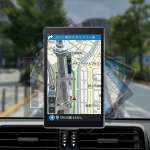 ダッシュボード上に専用スタンドで固定できるポータブル型。8型の大きなディスプレイは通常の横向きだけでなく縦向きにして進行方向を広く見ることもできる。フルセグタイプの高画質なテレビチューナーを搭載。