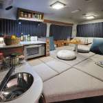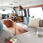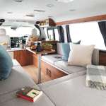 ▲REVOセカンドシートを後ろ向きにして、左右の横座りベンチでテーブルを囲むダイネットモード。ハイルーフのおかげで開放感は抜群