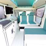 車名のとおりフロントソファとリヤベンチを向かい合わせにしてテーブルを囲む対座アレンジが可能。電子レンジ、冷凍冷蔵庫、DC12Vクーラー、リチウムイオンバッテリーも標準装備し、車中泊をオールシーズン快適に楽しめる。