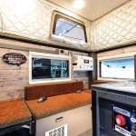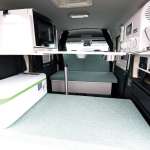 車中泊の必須アイテムを最低限押さえた人気モデルのポップアップルーフ版。4人就寝が可能で、ロフトスペースは就寝時の荷物置き場になる