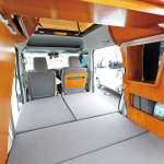 ベッド、キャビネット、テーブル、走行充電システムのみのシンプルな架装内容で、用途や予算に合わせてDIYでアレンジできるオートワンのピッコロキャンパー+。4人就寝を可能にするためにポップアップルーフを架装した。