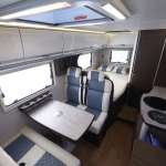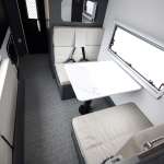 ▲横座りシートを対面させたダイネット、エントランス対面にキッチン、最後部に2段ベッドにもなるマルチスペースを配置
