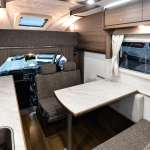 ▲リヤエントランスの利点は広々としたダイネット空間。キャブ上のせり出した部分がバンクベッド。こことフロアベッドで4人寝られる
