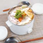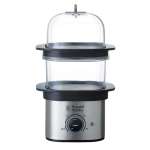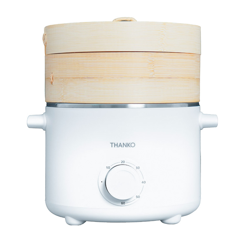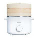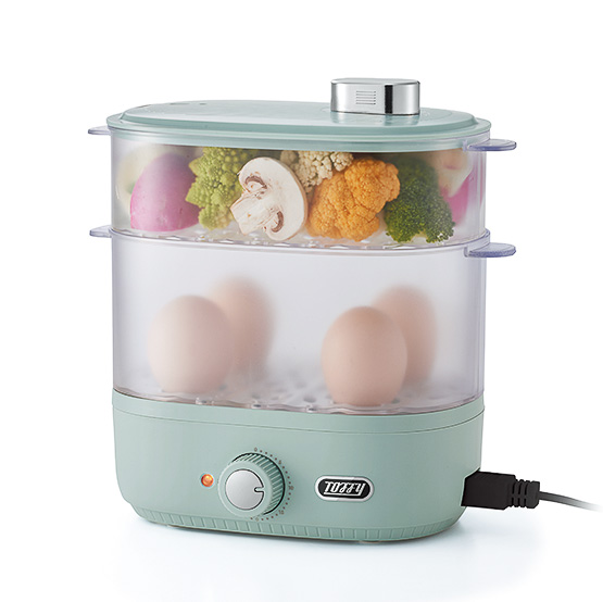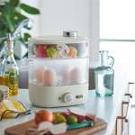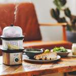 食材を入れ、ダイヤルを回すだけで蒸し料理ができる小型電気スチーマー。上下2段のスチームトレイを備え、異なるメニューを同時に調理できる。付属の調理カップを使えば茶碗蒸しや蒸しパンもお手のもの。