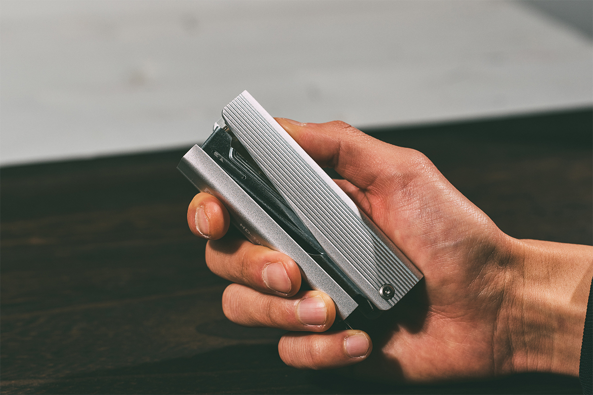 20枚とじの実用性能を備えつつ、デスク上で確かな存在感を放つ、MADE IN JAPANのフルメタルホッチキスです。