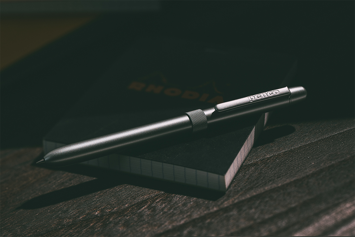赤・黒ボールペンと0.5mmシャープペンシルを1本に収めた、スリムな多機能ペン。直径約1.2cmの細軸ながら、日常で最も使用頻度の高い3つの機能を搭載しています。ボディは真鍮製で、マット塗装による落ち着いた質感が特徴。