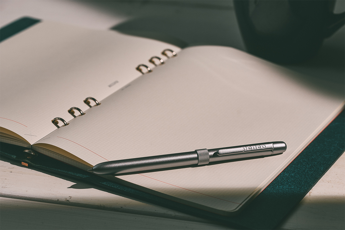 カラーは写真のシルバーのほか、チャコールグレー、アイボリー、ブロンズの4色展開で、いずれもマットなワントーン仕上げ。4C規格リフィルに対応しているため実用面も安心です。携帯性と質感を両立した、日常使いにちょうどいい多機能ペンといえます。