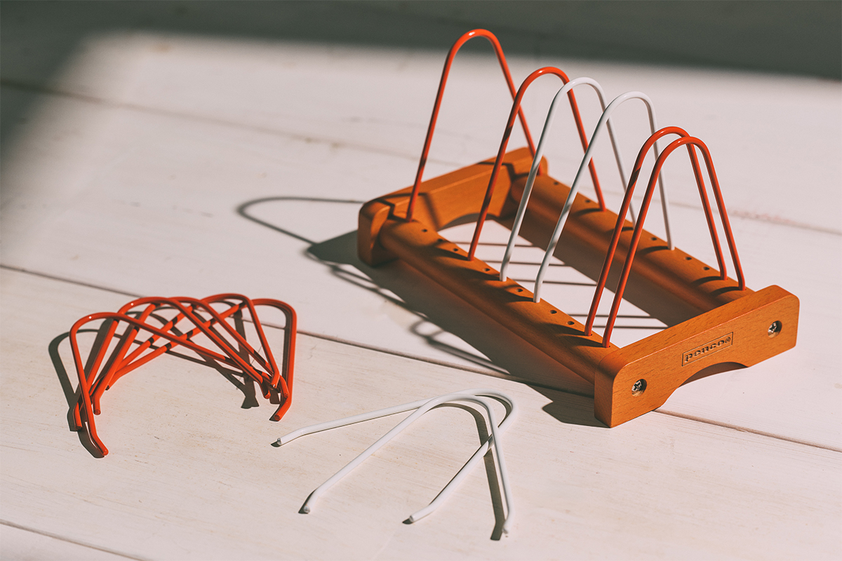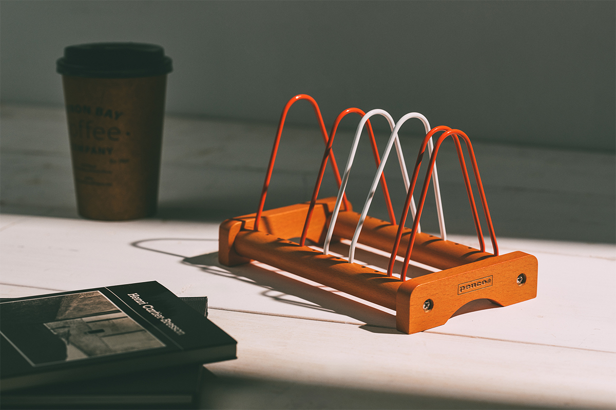 書類や郵便物、ポストカード、文庫本など、小ぶりな紙ものを立てて整理するのにちょうどいいラック。無垢のビーチ材に無骨なワイヤーを組み合わせ、レコードラックを思わせるレトロな佇まいに仕上げています。