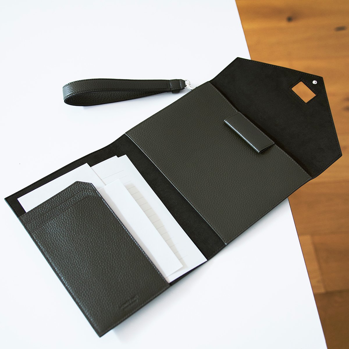封筒の形状がモチーフとなったノートホルダー。ひとつひとつ、イタリアの職人が作り上げたこちらは美しいシボ感が目を引きます。センターの留め具部分はペン挿しにもなっているため、同ブランドの万年筆やボールペンなどを携帯できるのもポイント。ストラップが付いており、持ち運びやすさもしっかりと考慮した実用性にも優れた一品です。