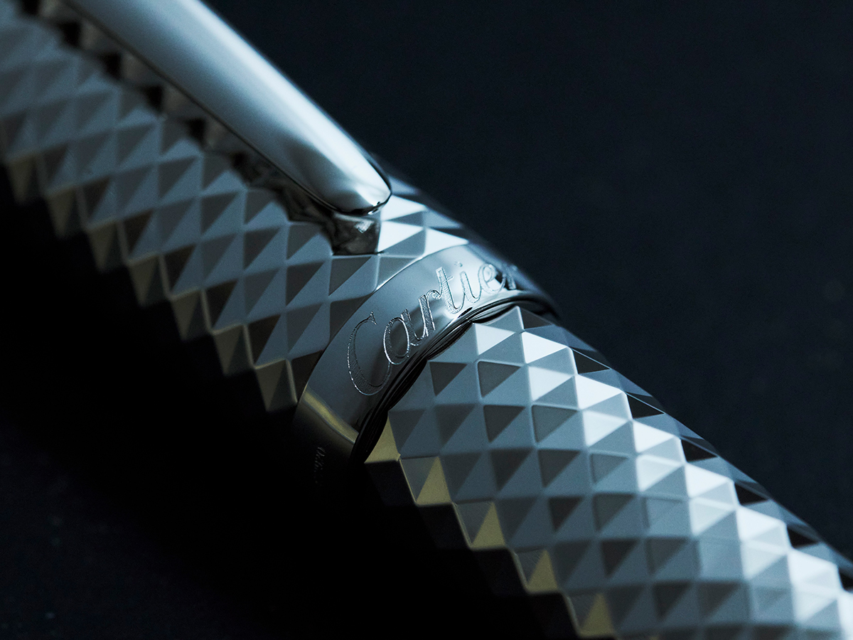 プラチナのような輝きを見せる、パラジウムフィニッシュ加工を施したこちら。カルティエが、世界の中でも非常に権威のあるメゾンだということがひと目見ただけでわかる、美しさ極まるボールペンです。規則正しく文様が並ぶエンボスメタルは完璧なまでに調和が取れており、それでいて握ると手にしっくり来る、そんなデザイン性と実用性を持ち合わせた一品となっています。