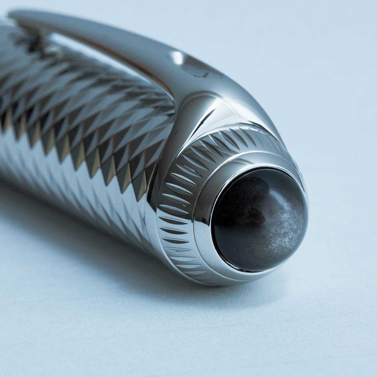 天冠(キャップトップ)部分にはオブシディアンを配置。吸い込まれるようなブラックに目を奪われますが、よく見ると少し透けています。それ故、立体的で繊細な表情に。まさに“宝飾”と言ったディテールは本物志向の大人が持つにふさわしいボールペンです。