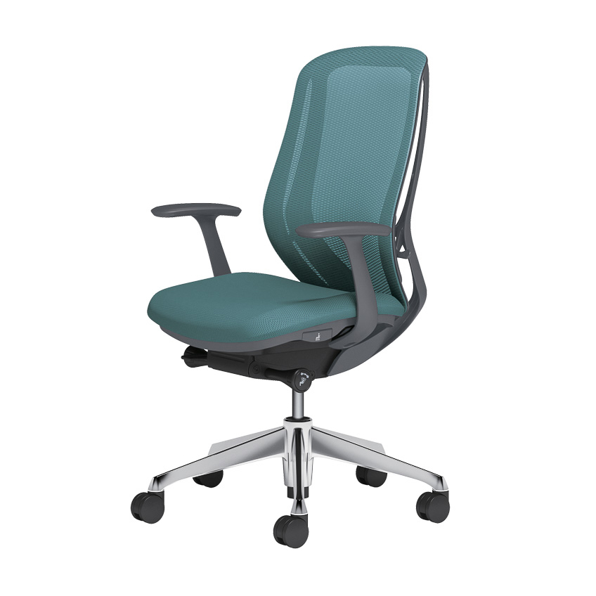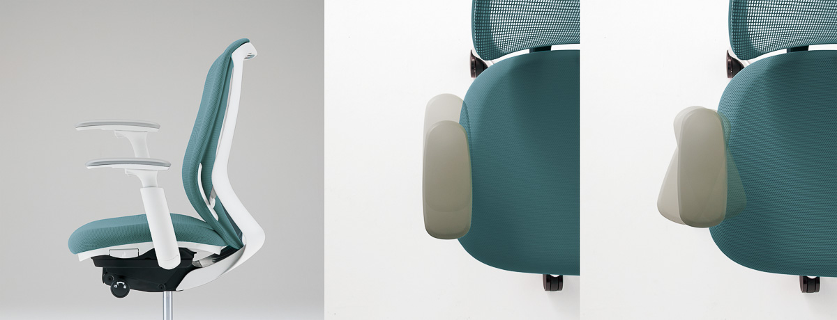 背にもたれると最大25°まで後傾、座面は最大30mm前方へスライド。背のロッキング機能と連動することで身体を安定して支え、自然と正しい着座姿勢へ導く。コンパクトながら理想の作業姿勢を保てる先進の設計。