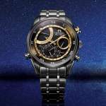 夜空に輝く星々が互いに影響し合い軌道を保つように、時の流れと宇宙の調和を表現。デュラテクトDLCを施した宇宙を想起させる漆黒のケースとバンドに、星の輝きを象徴するゴールドカラーが映える。美しい音色で時刻を知らせる「ミニッツリピーター」を搭載。