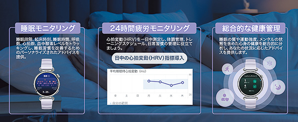 飛躍的に向上したロングバッテリーが常時装着を可能に。睡眠の質やストレス値を精緻に数値化し、アプリで一元管理。自身のコンディションを客観的に可視化する先進の一台。