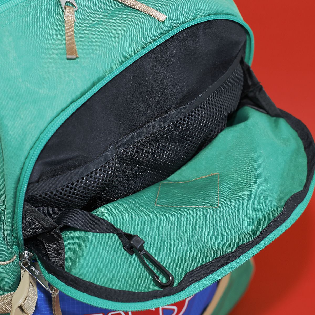 その見た目から“ブタ鼻”とも言われるピッケルホルダーが付いたレトロなデザインのこのリュック。黒もあるんですが、休みの日に背負うなら、やっぱり明るめな青や赤がオススメ。外観はシンプルながら、内側左右にボトル用メッシュポケットや、キークリップ付きのメッシュファスナーポケットが付いているなど、使い勝手も問題なし。古着スタイルにもしっくりくるリュックです。