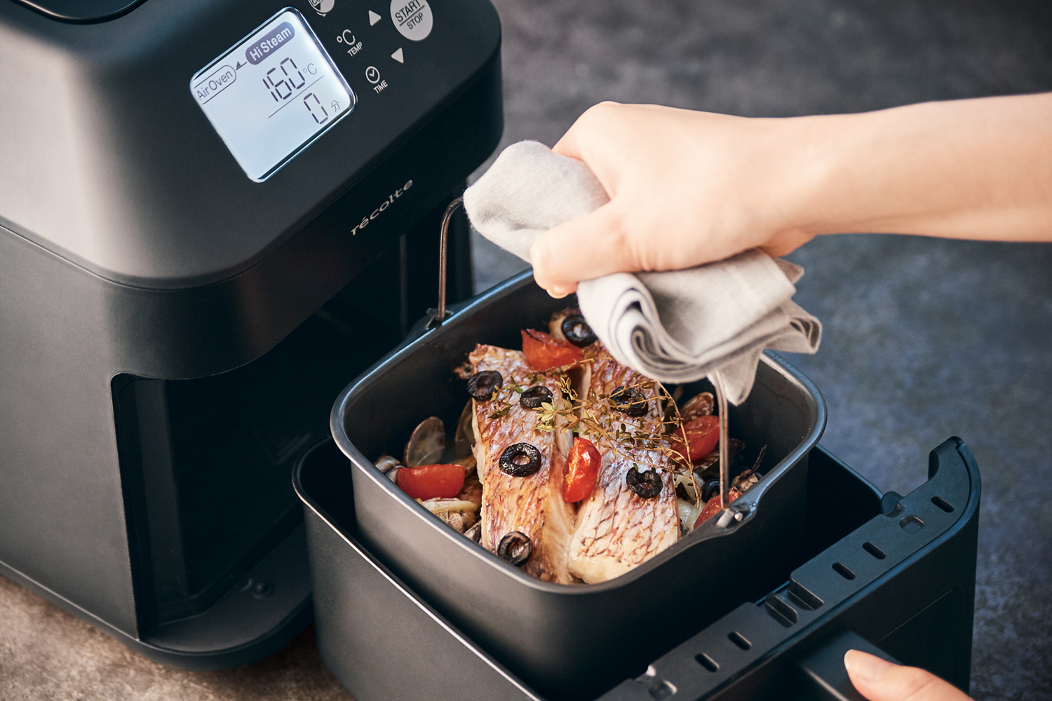 惣菜の温め直しから本格調理まで、幅広く活躍してくれるのがレコルト「ハイスチーム エアーオーブン」(2万9700円)です。しっとり仕上げるか、香ばしく焼くか、あるいは両方をいいとこ取りするか。料理に合わせて加熱のアプローチを変えられるのが、このモデルの面白さ。