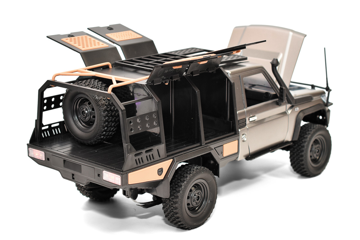 1984年誕生ながら今なおファンの多い「ランクル79」が1/12 RCカー「オーバーランド仕様」(大陸横断仕様)として爆誕! カラーはガンメタとマットブラックの2色展開。リアキャノピーや装備類は着脱可能だ。全長約360×全幅約154mm。ヘッドライト点灯。車体、送信機、バッテリー、充電器、ステッカー、アクセサリー、フィギュアなどがセットの完成済みRCカーだ。