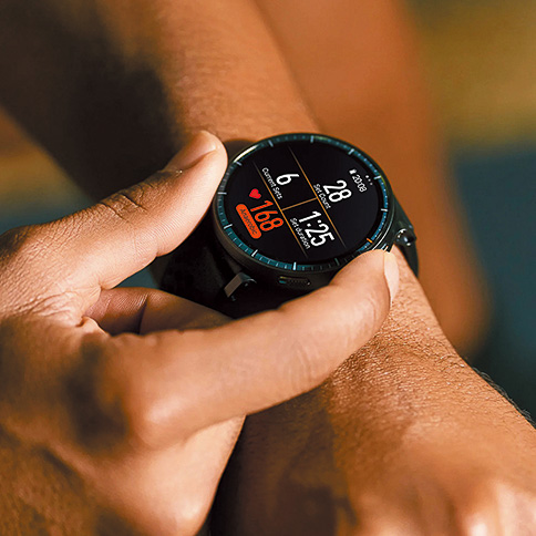1.5インチの超高輝度AMOLEDディスプレイで、屋内でも屋外でもデータをひと目で確認することが可能。大容量ストレージを備え、オフラインマップの探索機能も持つ。大容量バッテリーで最大21日間使用可能。